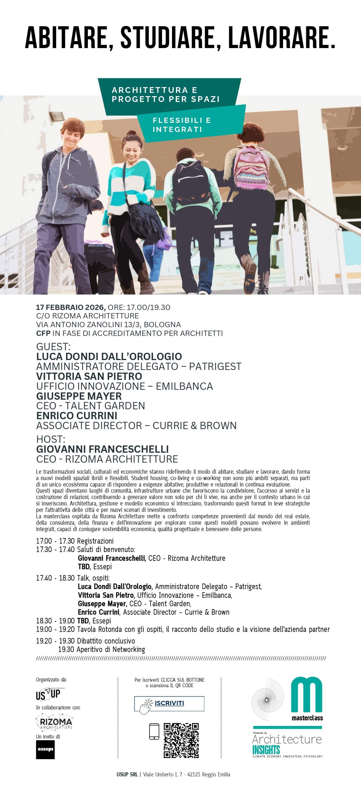 La masterclass ospitata da Rizoma Architetture mette a confronto competenze provenienti dal mondo del real estate, della consulenza, della finanza e dell’innovazione per esplorare come questi modelli possano evolvere in ambienti integrati, capaci di coniugare sostenibilità economica, qualità progettuale e benessere delle persone.