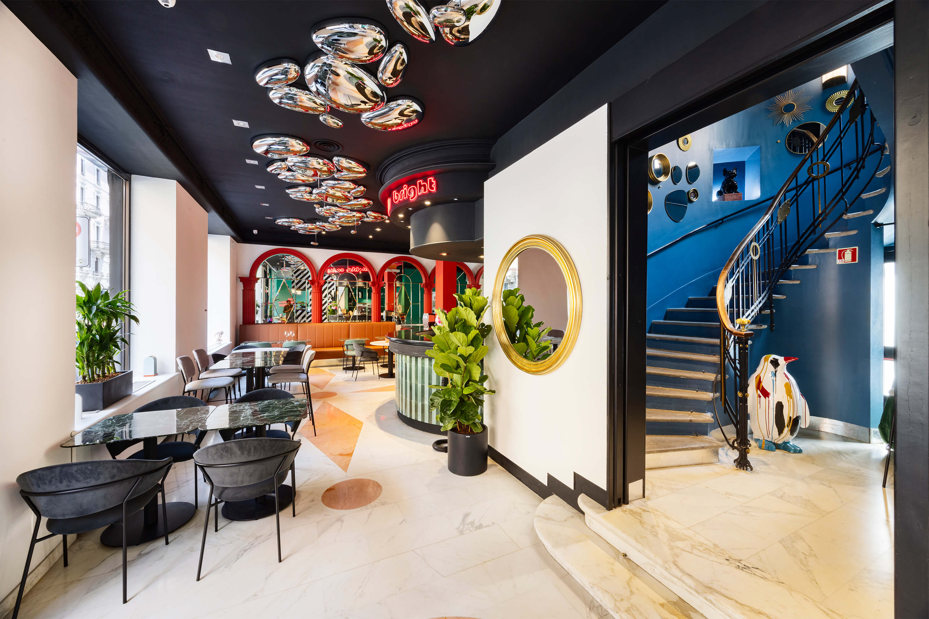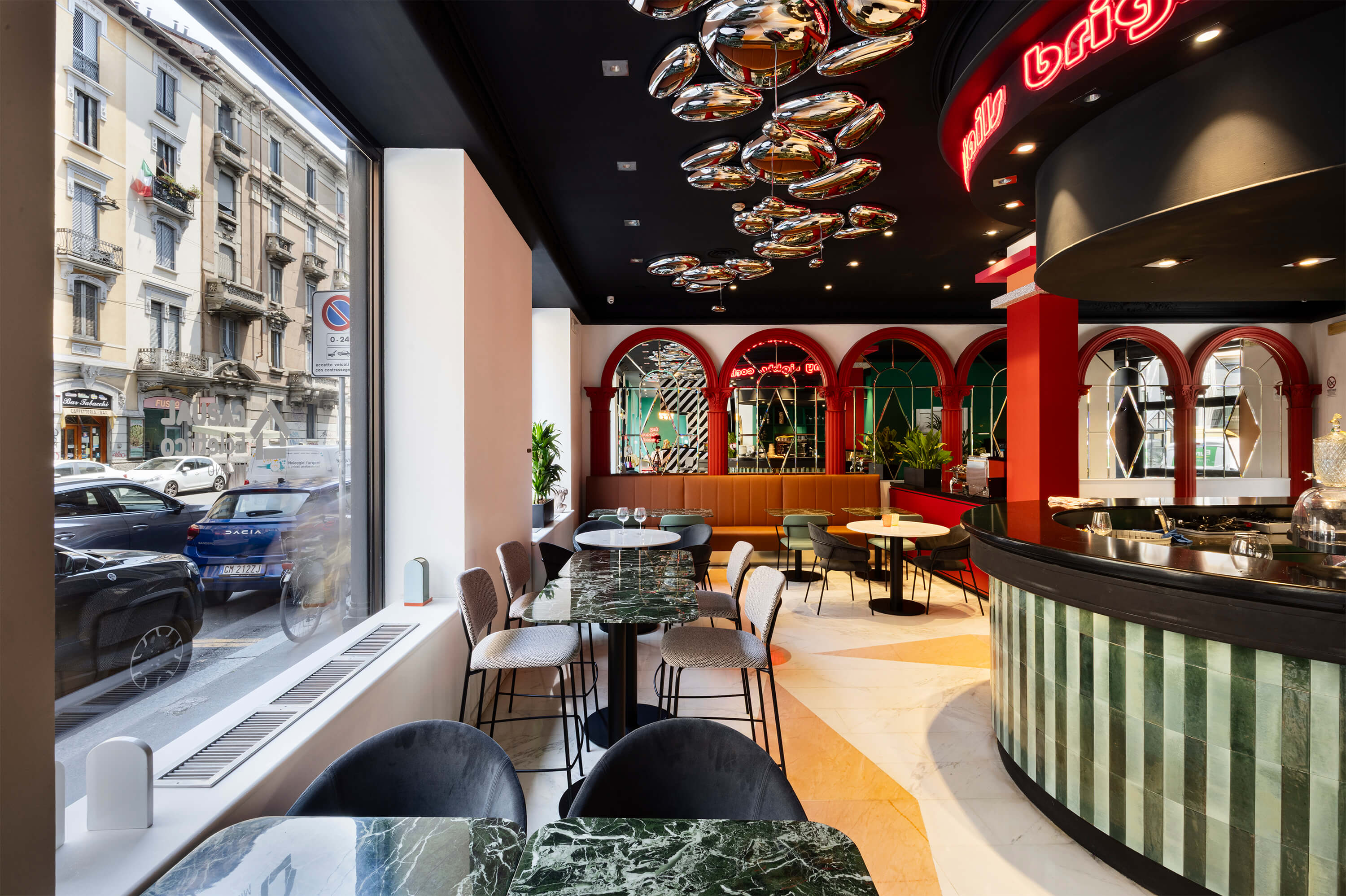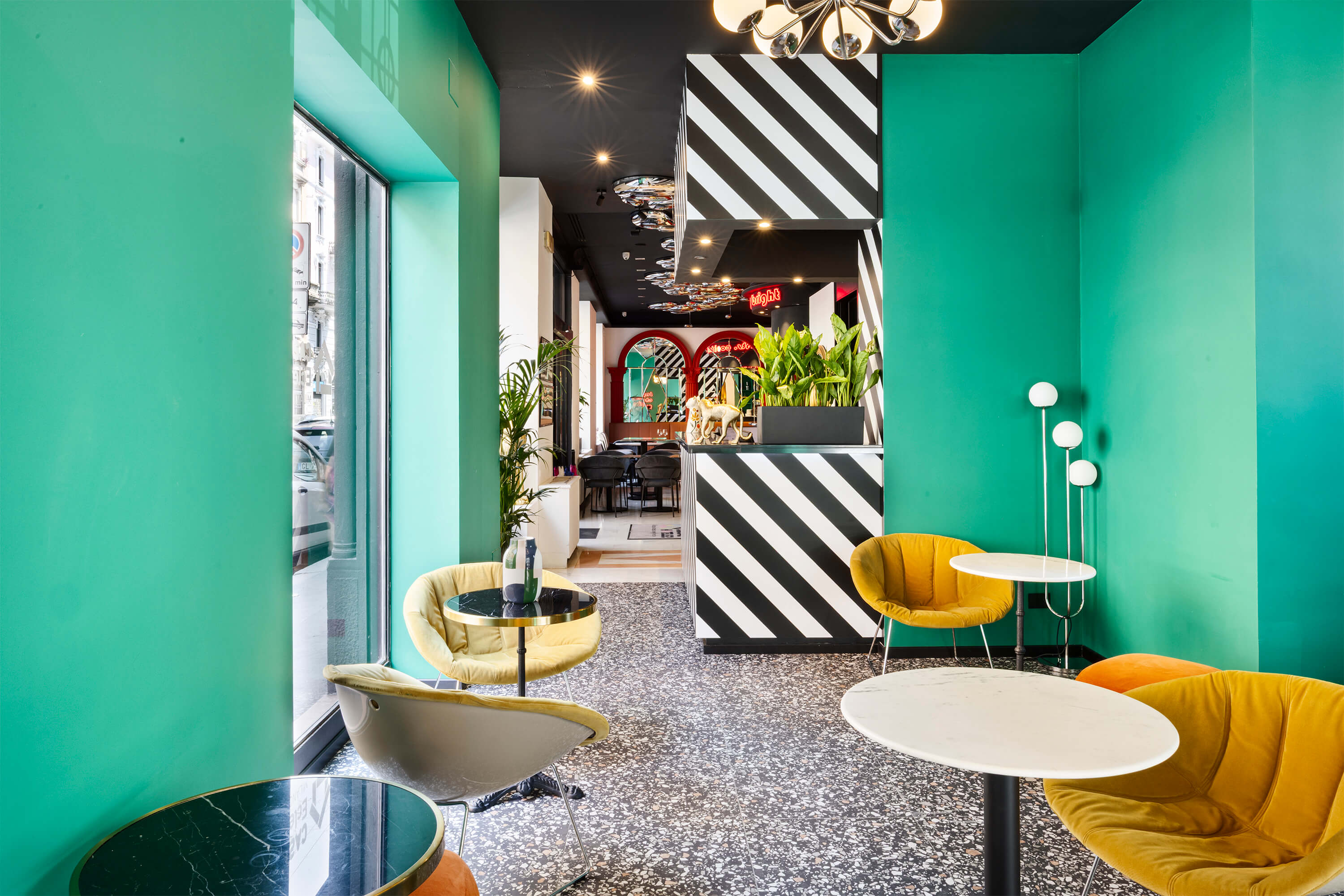 La sua cifra stilistica si fonda su un dialogo avvincente tra passato e presente: la raffinata eleganza dell’Art Nouveau (o stile Liberty) si intreccia con la vivacità e il dinamismo della cultura pop e disco degli anni ’80. Così, in un contesto urbano caratterizzato da palazzi ottocenteschi e vivaci quartieri notturni, esternamente Casual Milano appare come una gigantesca black box, a causa del colore nero che riveste ogni dettaglio della facciata. All’interno invece, trova spazio un tripudio di colori dalla palette audace per toni e motivi, con vinili, carte da parati e dettagli che richiamano l’estetica pop di un decennio che ha sfidato le regole e celebrato la libertà creativa.