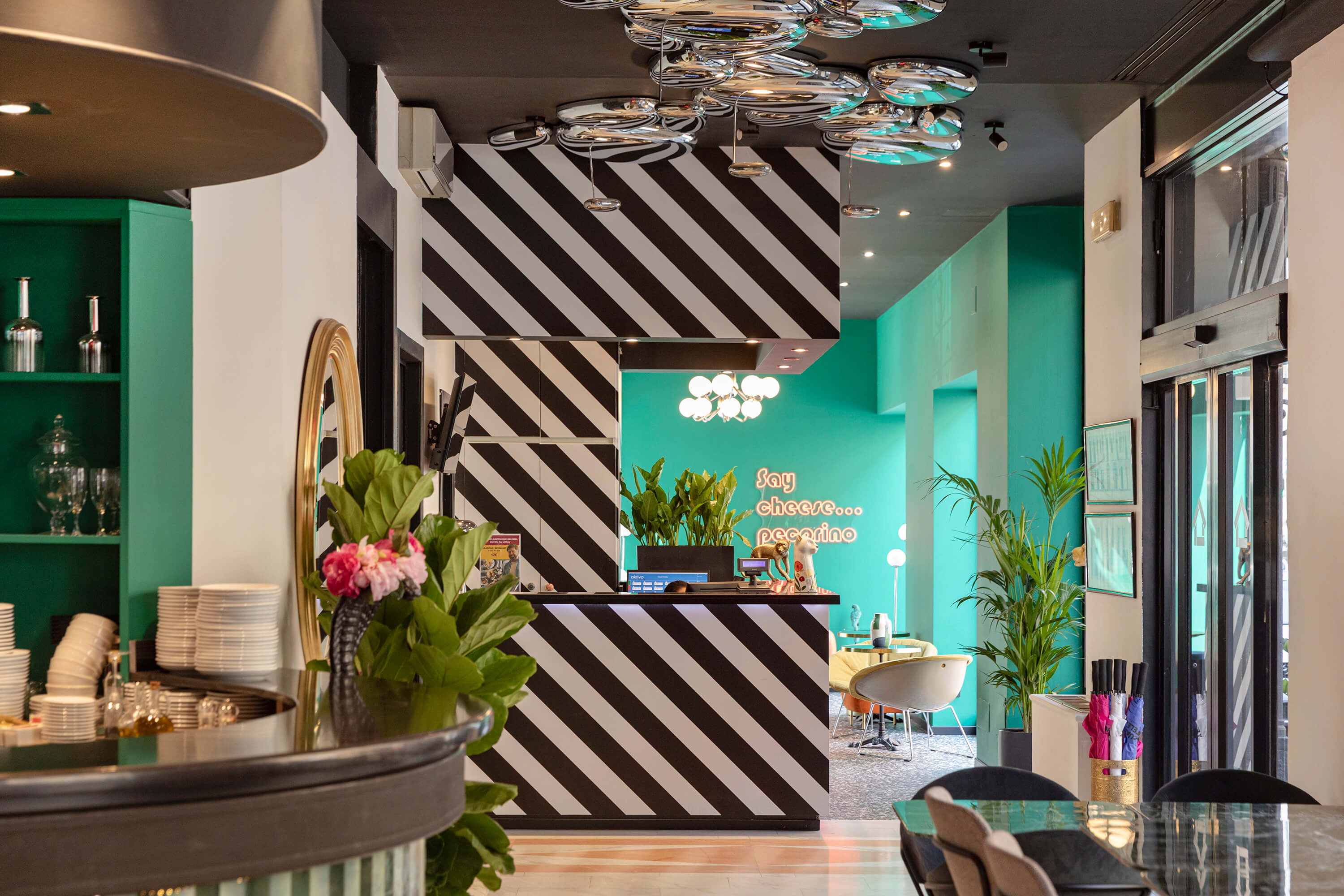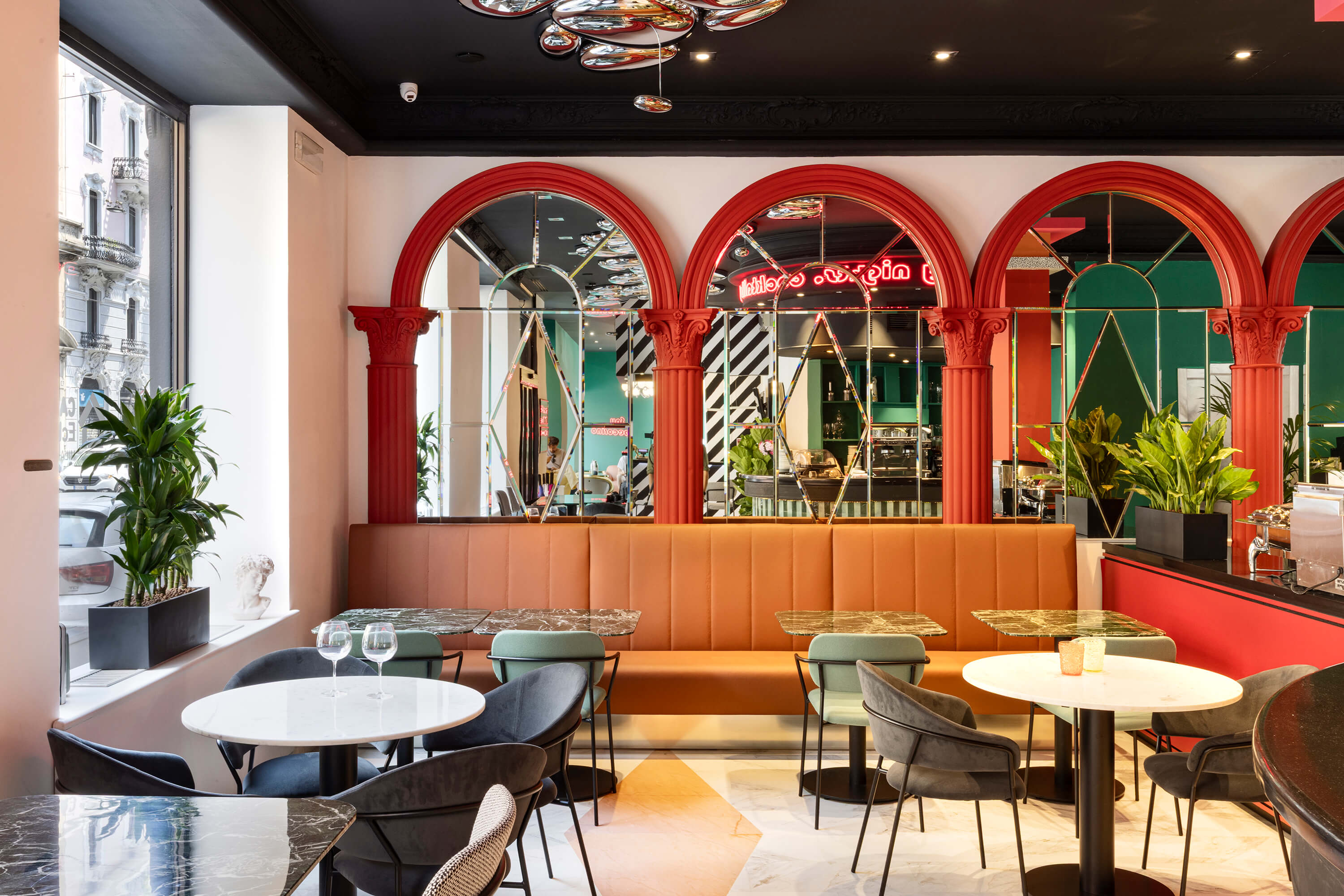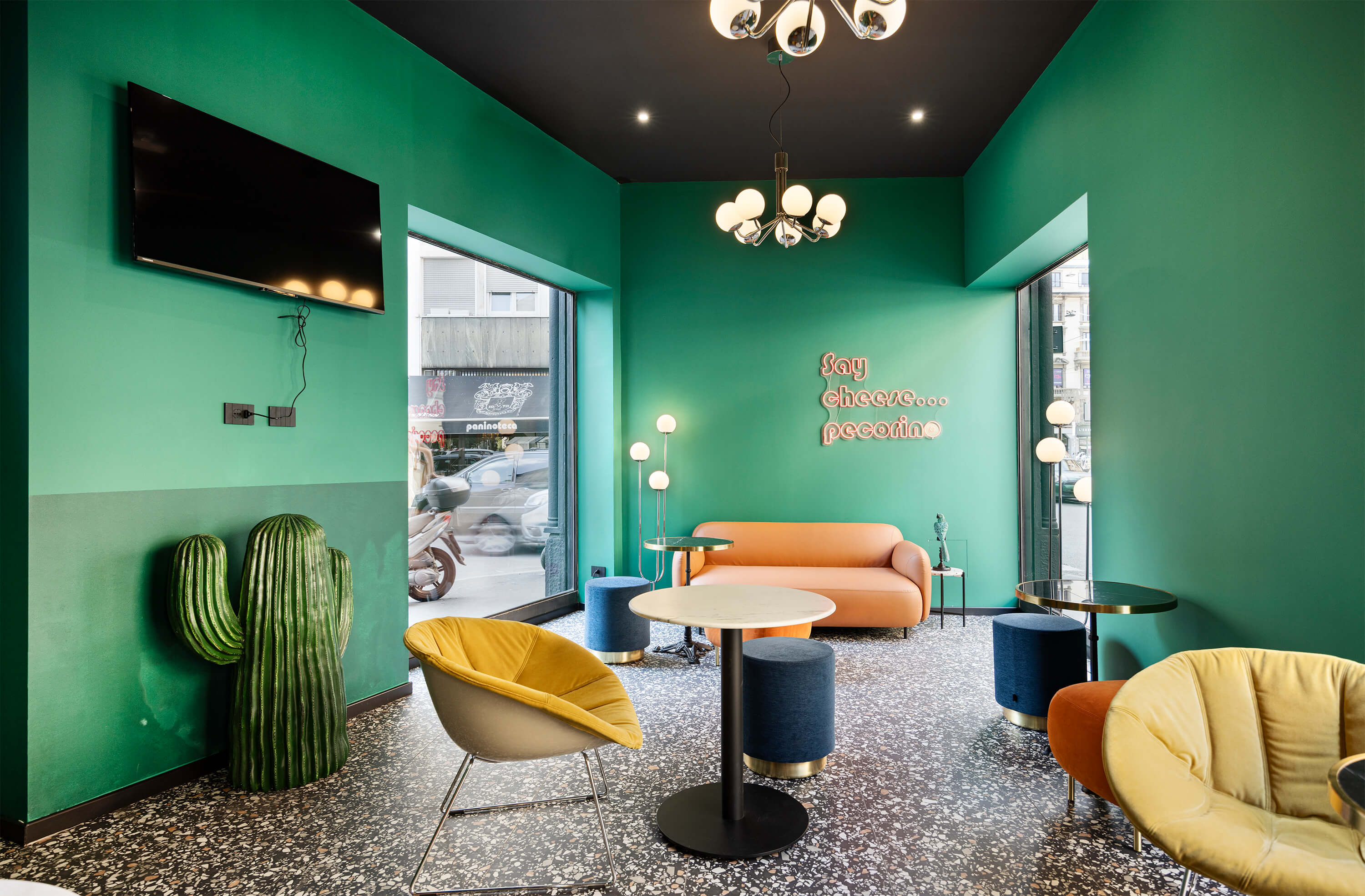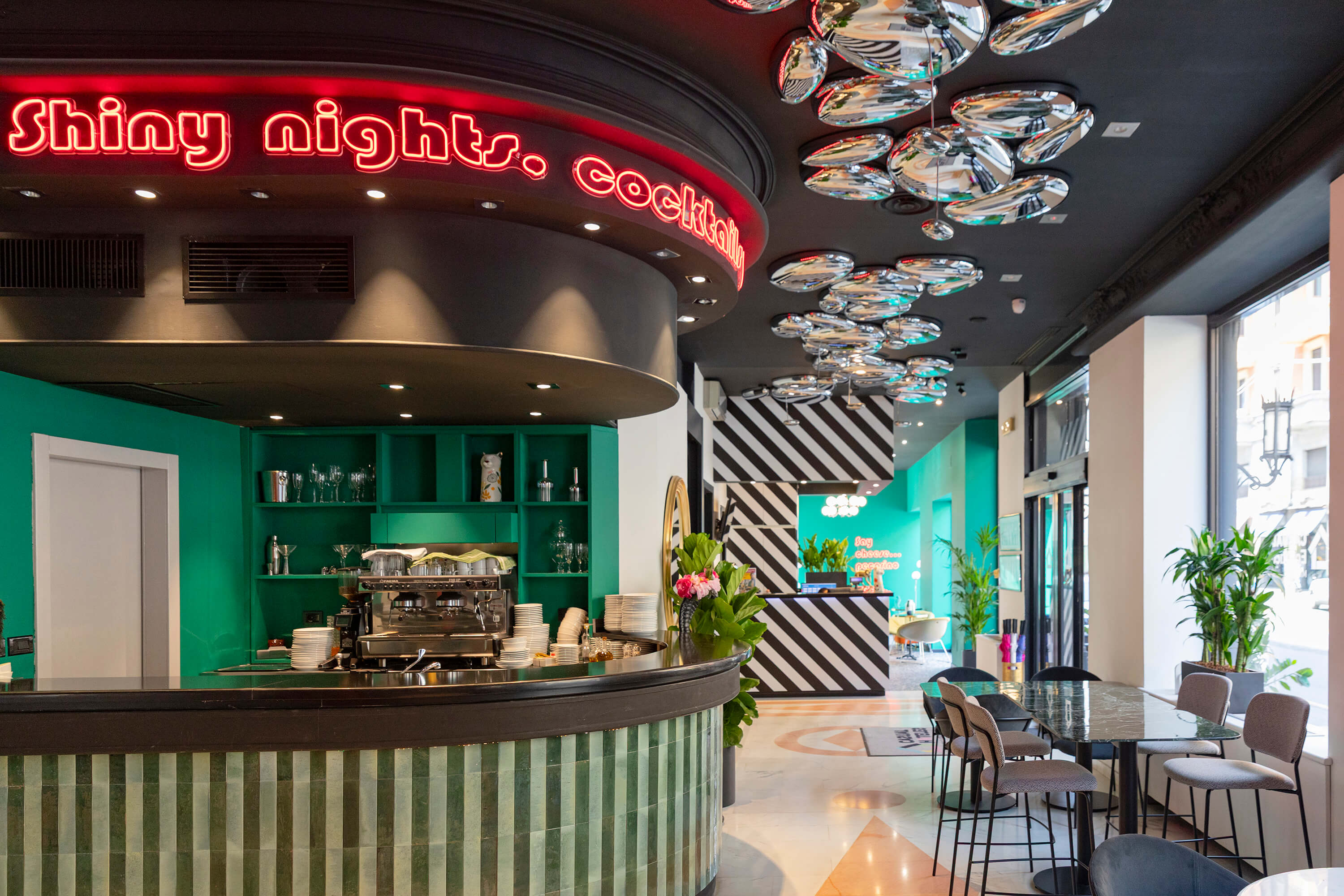 La sua cifra stilistica si fonda su un dialogo avvincente tra passato e presente: la raffinata eleganza dell’Art Nouveau (o stile Liberty) si intreccia con la vivacità e il dinamismo della cultura pop e disco degli anni ’80. Così, in un contesto urbano caratterizzato da palazzi ottocenteschi e vivaci quartieri notturni, esternamente Casual Milano appare come una gigantesca black box, a causa del colore nero che riveste ogni dettaglio della facciata. All’interno invece, trova spazio un tripudio di colori dalla palette audace per toni e motivi, con vinili, carte da parati e dettagli che richiamano l’estetica pop di un decennio che ha sfidato le regole e celebrato la libertà creativa.