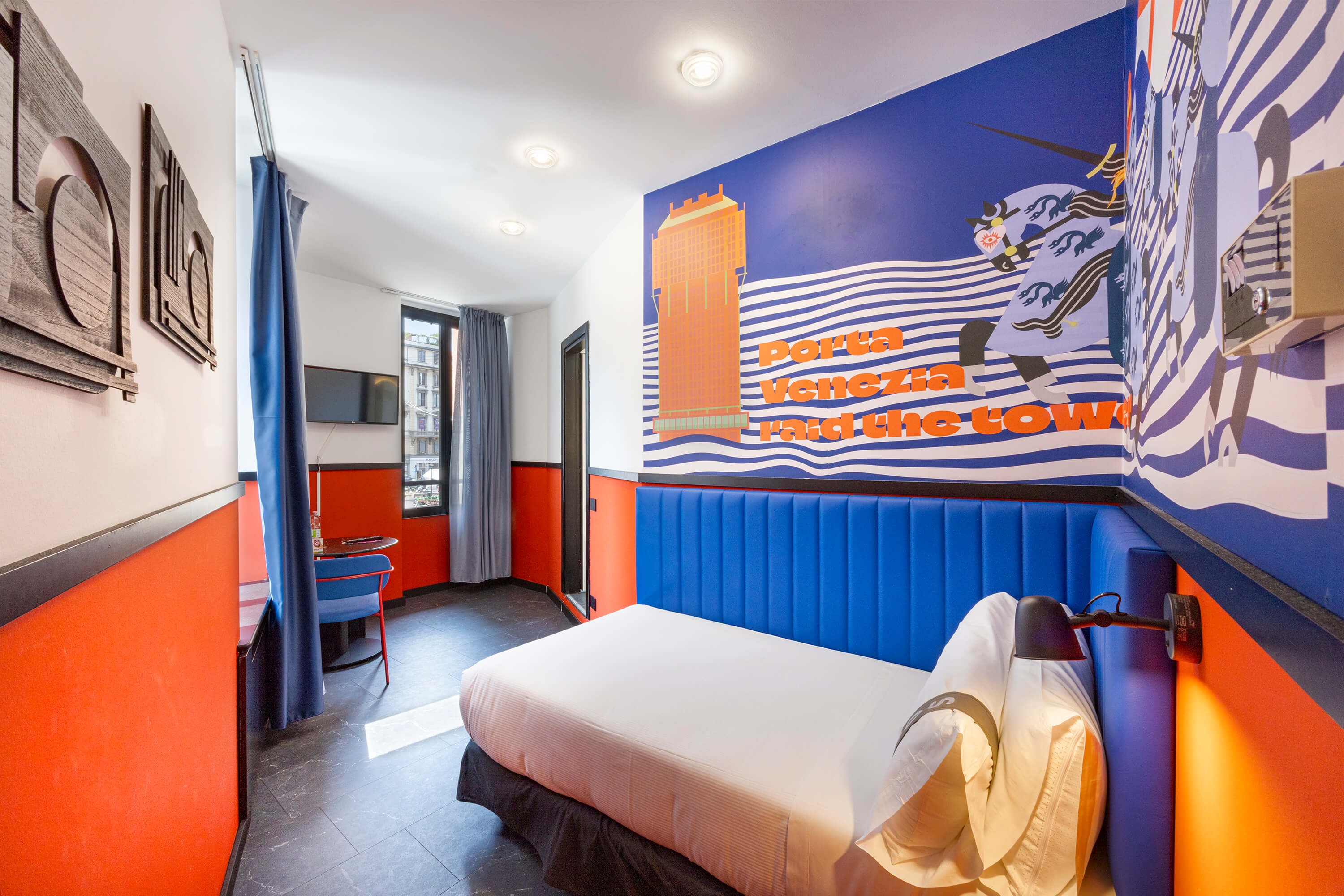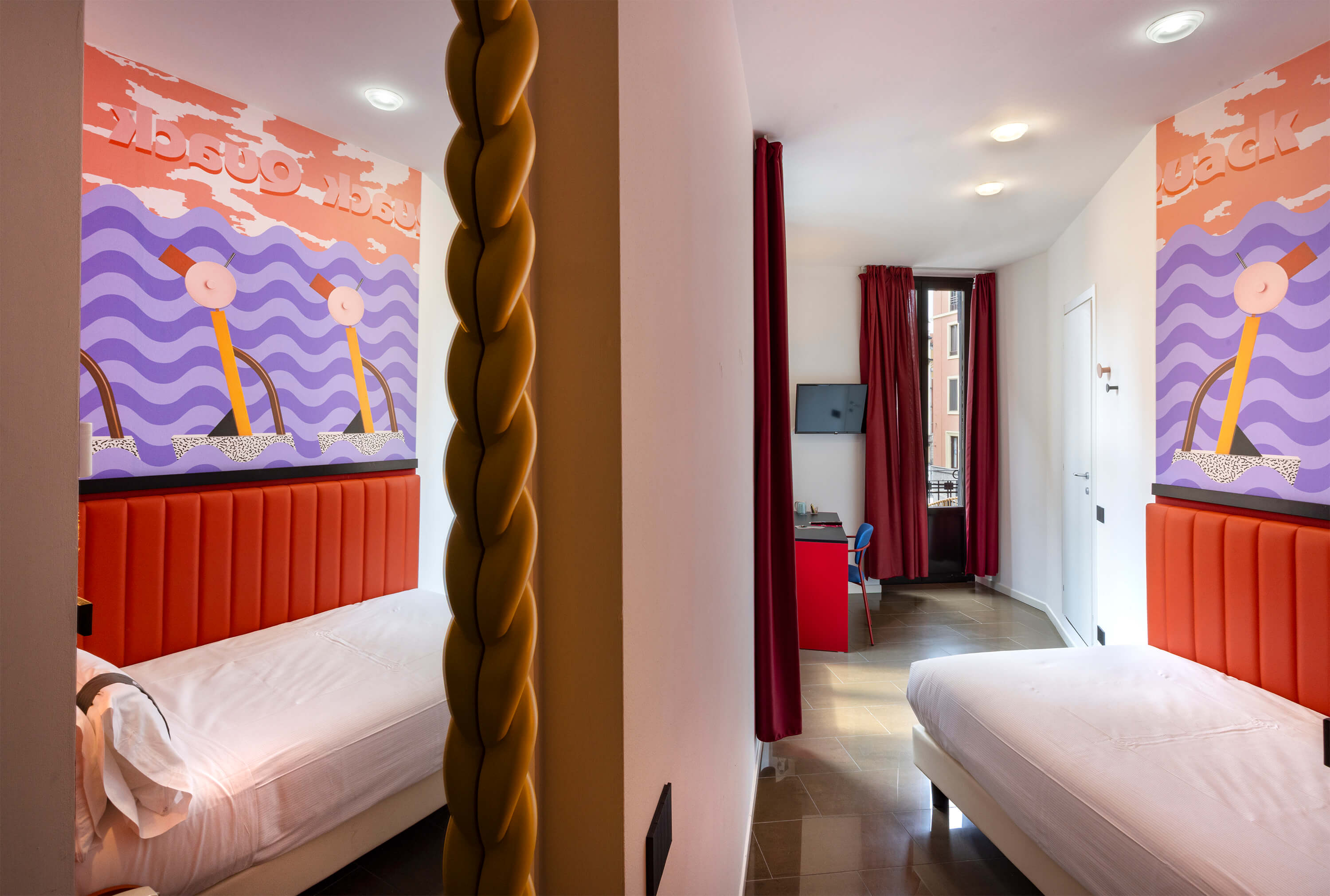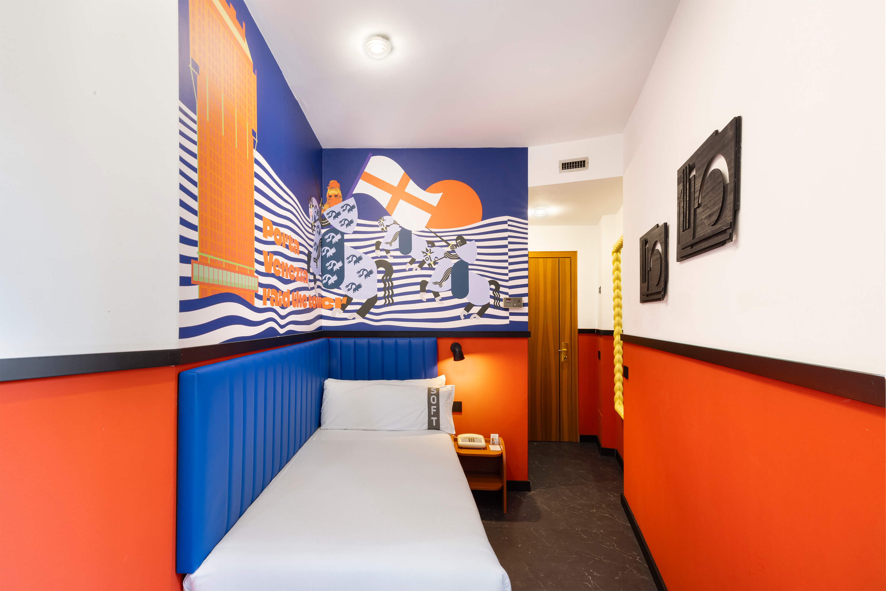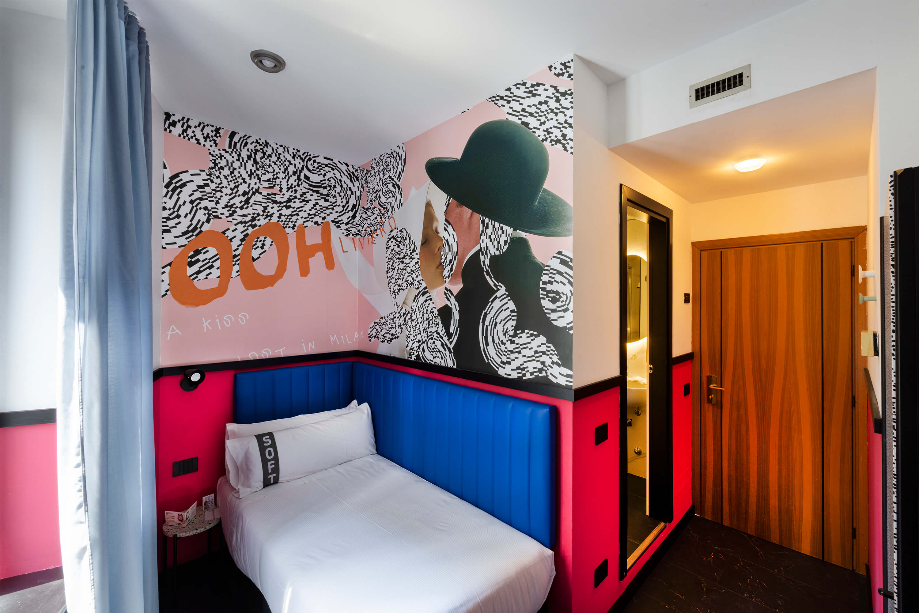 La visione progettuale di Rizoma Architetture si manifesta nei 43 ambienti dell’hotel, dove ogni stanza diventa un piccolo universo di design. Le camere, definite come opere d’arte, sono contraddistinta da illuminazione dinamica, colori vibranti e dettagli iconici e da un wallpaper tematico che rappresenta un omaggio alla creatività e al design milanese. La scelta di combinare stili apparentemente distanti fra loro — l’eleganza delle curve sinuose e dei decori floreali tipici del Liberty con l’audace geometria e i riferimenti pop — genera un effetto scenografico e stratificato.