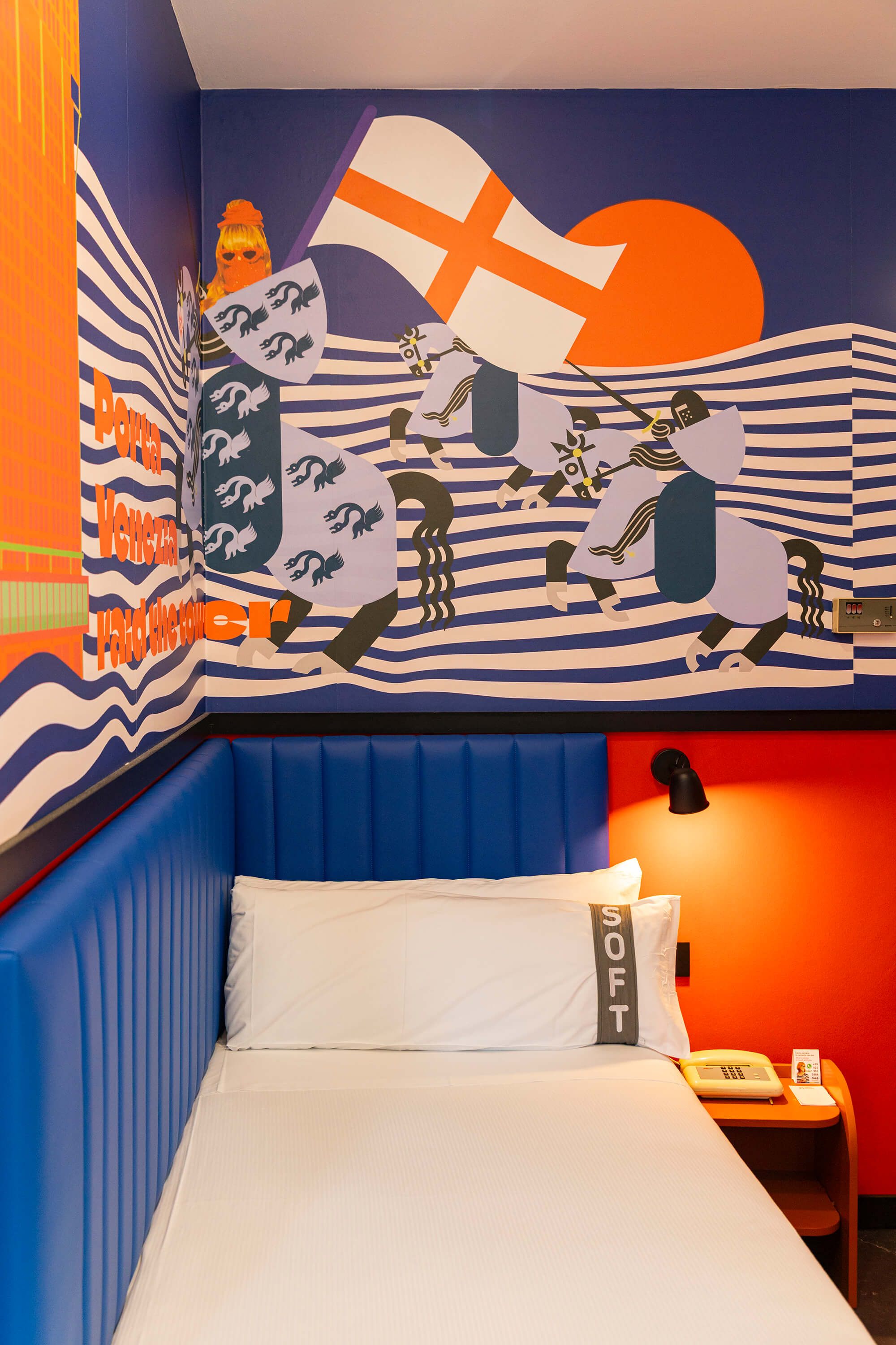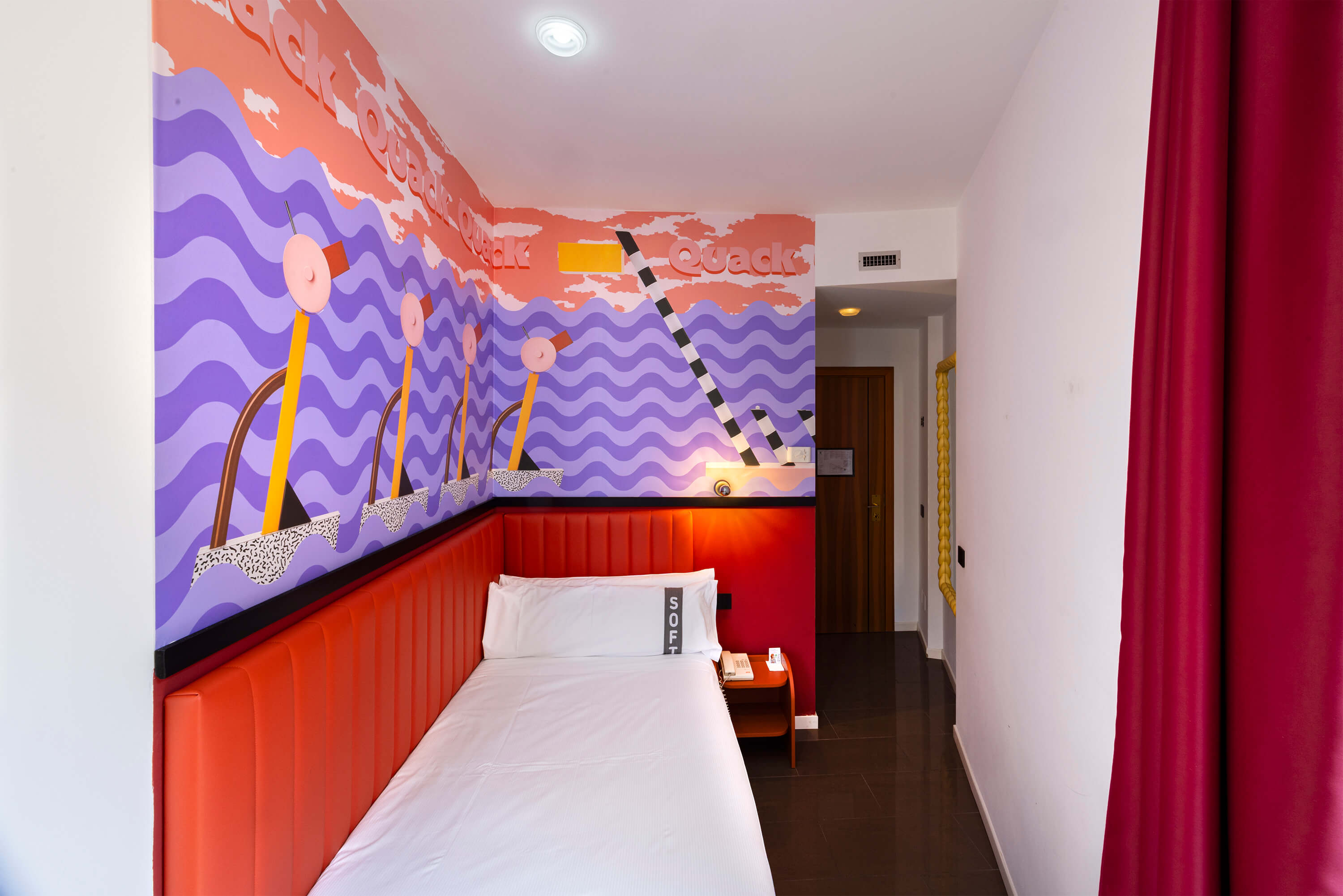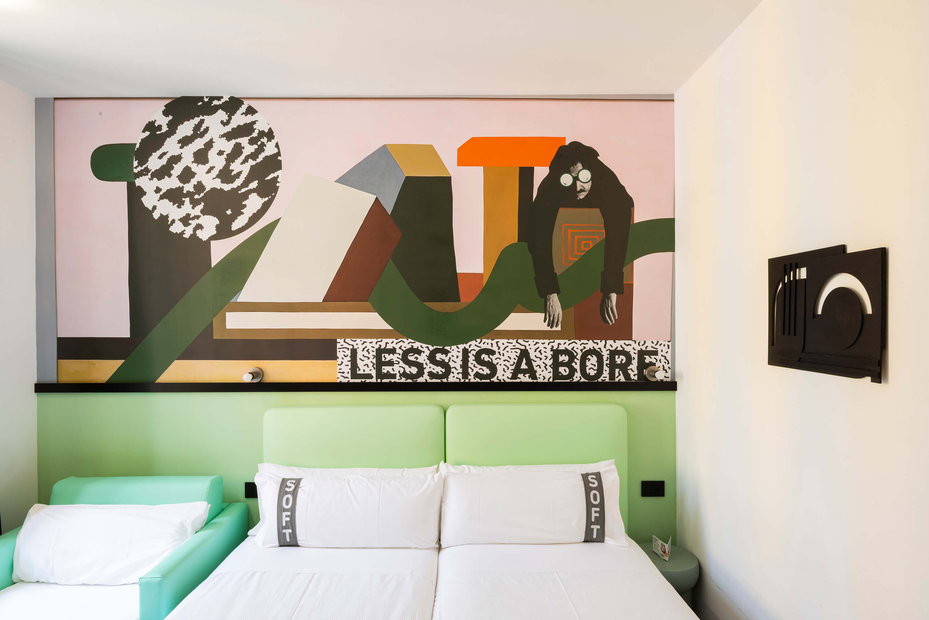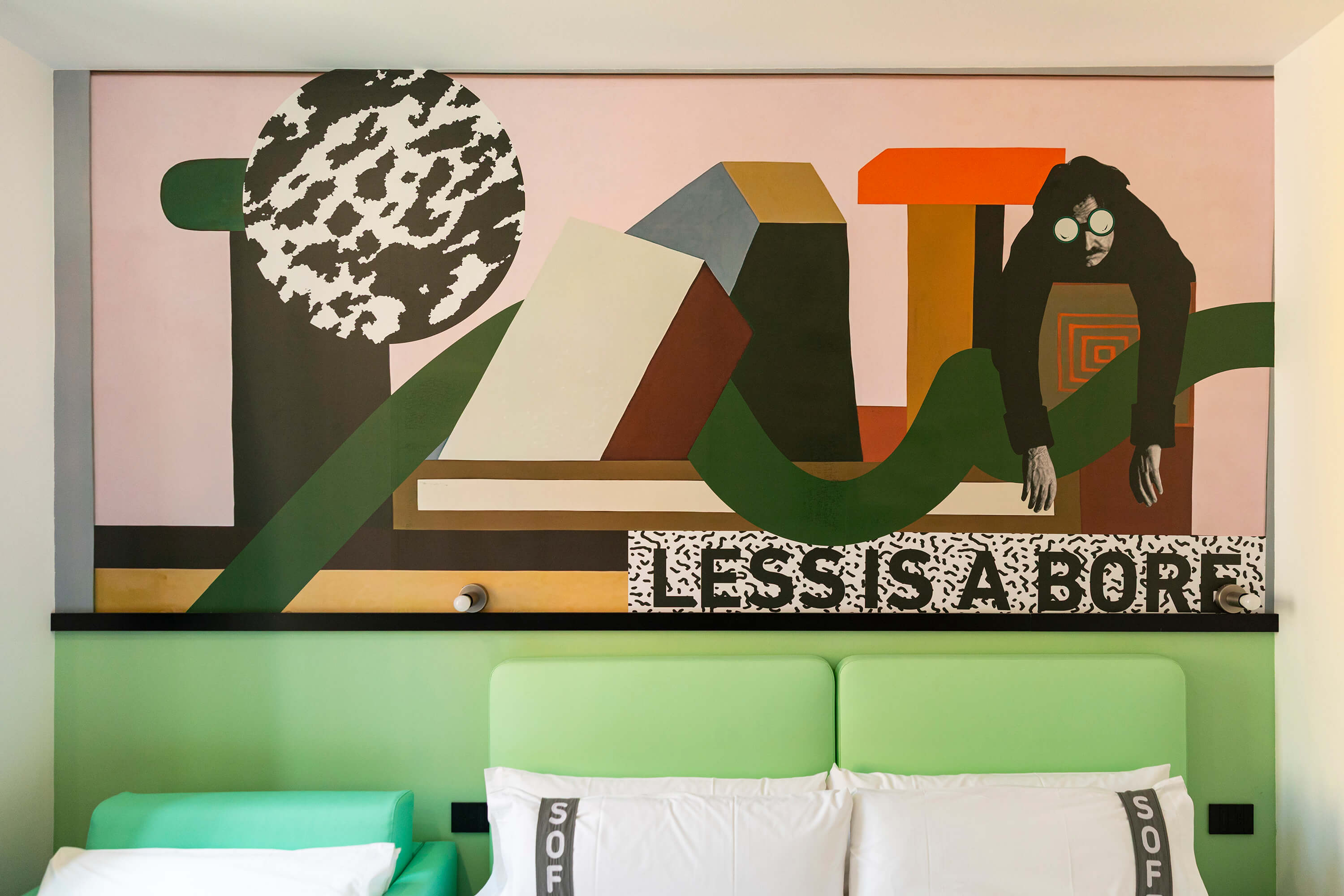 La visione progettuale di Rizoma Architetture si manifesta nei 43 ambienti dell’hotel, dove ogni stanza diventa un piccolo universo di design. Le camere, definite come opere d’arte, sono contraddistinta da illuminazione dinamica, colori vibranti e dettagli iconici e da un wallpaper tematico che rappresenta un omaggio alla creatività e al design milanese. La scelta di combinare stili apparentemente distanti fra loro — l’eleganza delle curve sinuose e dei decori floreali tipici del Liberty con l’audace geometria e i riferimenti pop — genera un effetto scenografico e stratificato.