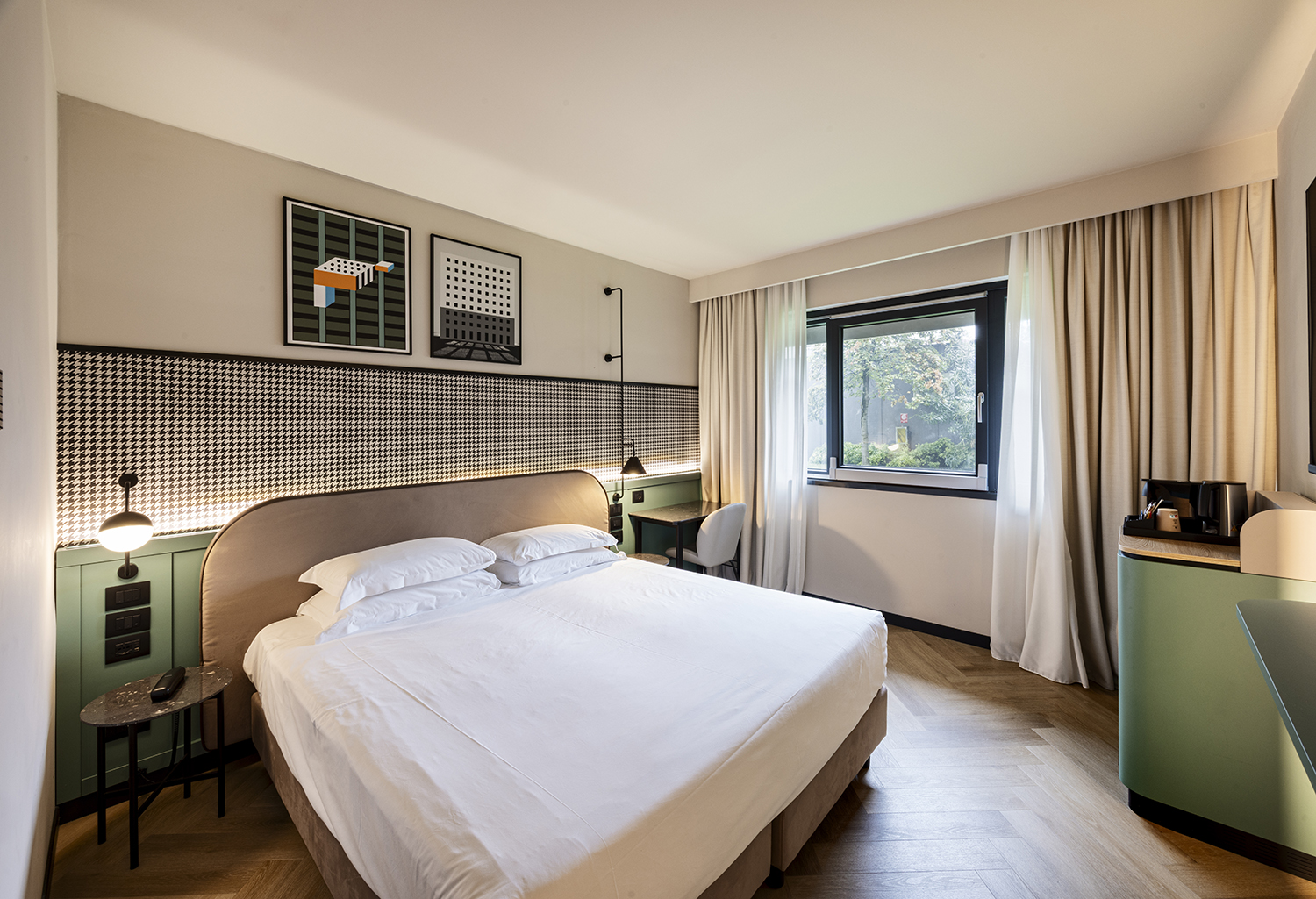 La prima impressione è di quella di un’estetica contemporanea, pulita e ariosa, impreziosita però da note retrò: una sorta di minimalismo a metà tra l’essenzialità dell’arredo attuale e l’abbondanza di richiami al gusto “pop-geometrico” anni ’20 e anche ‘60. Così, la lampada da notte è in stile vintage industriale, la texture fittamente quadrettata della carta da parati richiama l’Optical Art e i quadri alle pareti sono un omaggio allo stile Postmodern e Memphis. Un’abbondanza di linee nette, nere, perpendicolari si susseguono lungo le pareti in un giocoso contrasto di forme e proporzione con le linee arrotondate dell’arredo: dalle testate dei letti, alle specchiere, tavolini e poltrone.